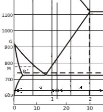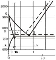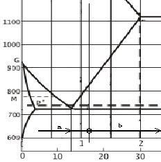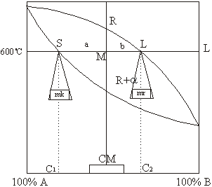 Sastave kristala a i rastopa L, dobijamo na isti način. Kroz tačku M pri 60 % A i 600 oC povuče se horizontalna linija. Ona presijeca solidus krivu u tački S, a likvidus u tački L koje određuju koncentracioni sastav kristala i rastopa na toj temperturi. (C1 i C2).