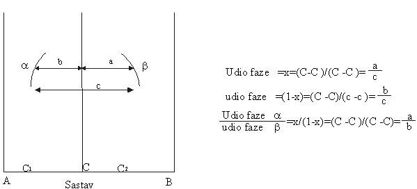 Neka legura čija se tačka stanja (CM,T) nalazi u dvofaznoj oblasti, sastoji se iz dvije faze različitog sastava, pri čemu je odnos količina obe faze dat položajem tačke stanja u odnosu na granične linije. Posmatrajmo leguru sa 60% A ili 40% B zagrijanu na 600 oC. Tačka stanja M unesena je u dijagram na (sl. 1.) Legura se na toj temperaturi, prema dijagramu stanja sastoji od kristala a, sastava S, (bogatih komponentom A) i rastopa sastava L, bogatog komponentom B.